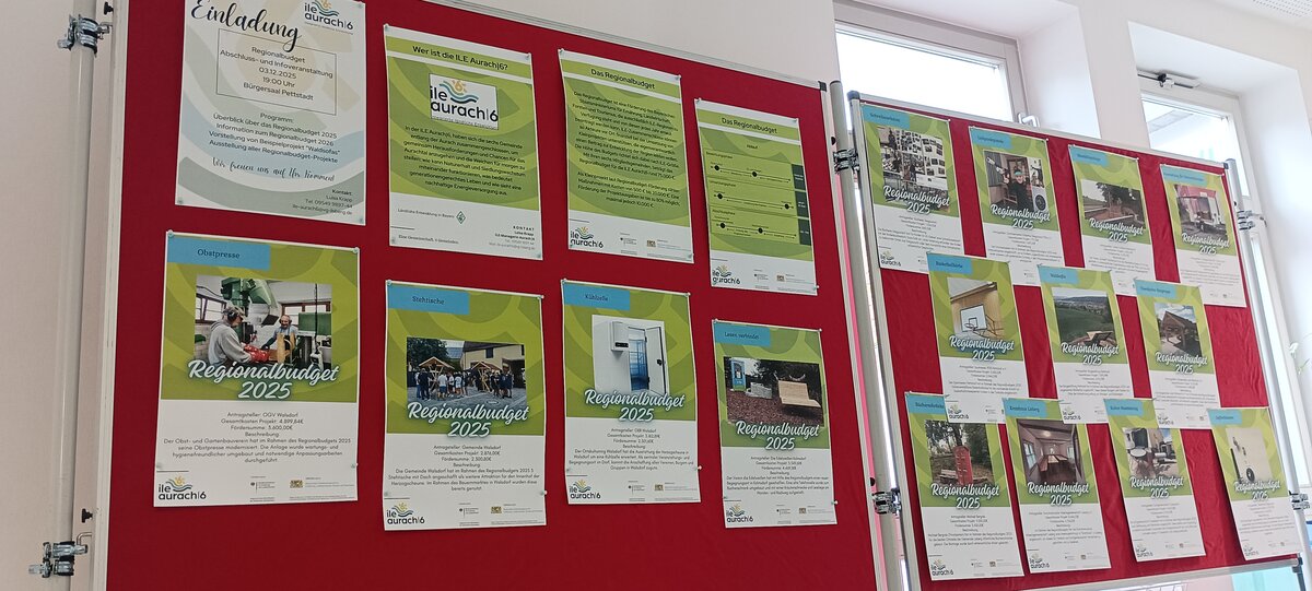 Die ILE Aurach|6 zeigt in einer kleinen Austellung die Projekte, die die ILE in diesem Jahr mit der Kleinprojekt-Förderung "Regionalbudget" des Bayerischen Staatsministeriums für Landwirtschaft, Ernährung, Forsten und Tourismus unterstützen konnte.Wer sich ansehen möchte, welche Projekte 2025 umgesetzt wurden, sich über das Regionalbudget informieren will oder Inspiration für eigene Projektideen sammeln will, der hat in den ILE-Gemeinden nun die Möglichkeit. Beginn der Wander-Ausstellung ist ab heute bis Freitag in Walsdorf. Von da an geht es weiter nach Stegaurach, Pettstadt und Lisberg. Untenstehend die genauen Infos, wo und wann die Ausstellung in den Gemeinden besichtigt werden kann: